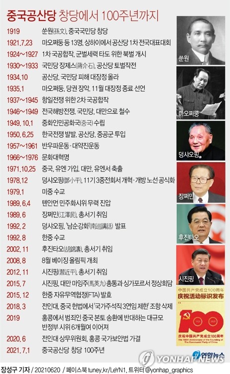 | ▲ [그래픽] 중국공산당 창당에서 100주년까지 (서울=연합뉴스) 김영은 기자 = 중국공산당이 다음 달 1일 창당 100주년을 맞는다. 0eun@yna.co.kr 트위터 @yonhap_graphics 페이스북 tuney.kr/LeYN1 |