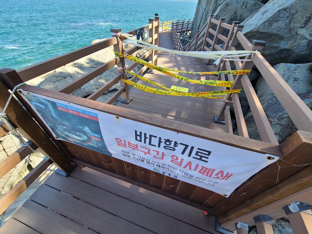 하지만 산책로가 바다와 인접해 있어 그동안 여러 차례 너울성 파도에 시설이 파손되는 피해를 본데다 지난해 9월 제10호 태풍 '하이선'에 외옹치 구간 394m의 난간과 철제 기둥 기초가 유실돼 관광객 출입이 통제됐다.