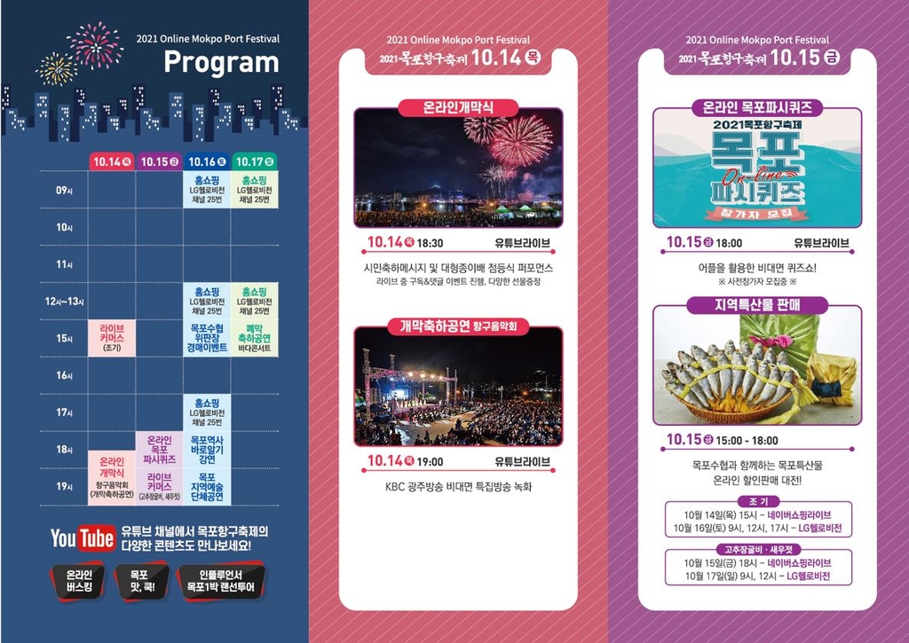 김종식 목포시장은 "많은 시민과 관광객이 알차고 다양한 온라인 프로그램에 참여해 항구도시 목포의 매력을 즐기시기를 바란다"고 밝혔다.