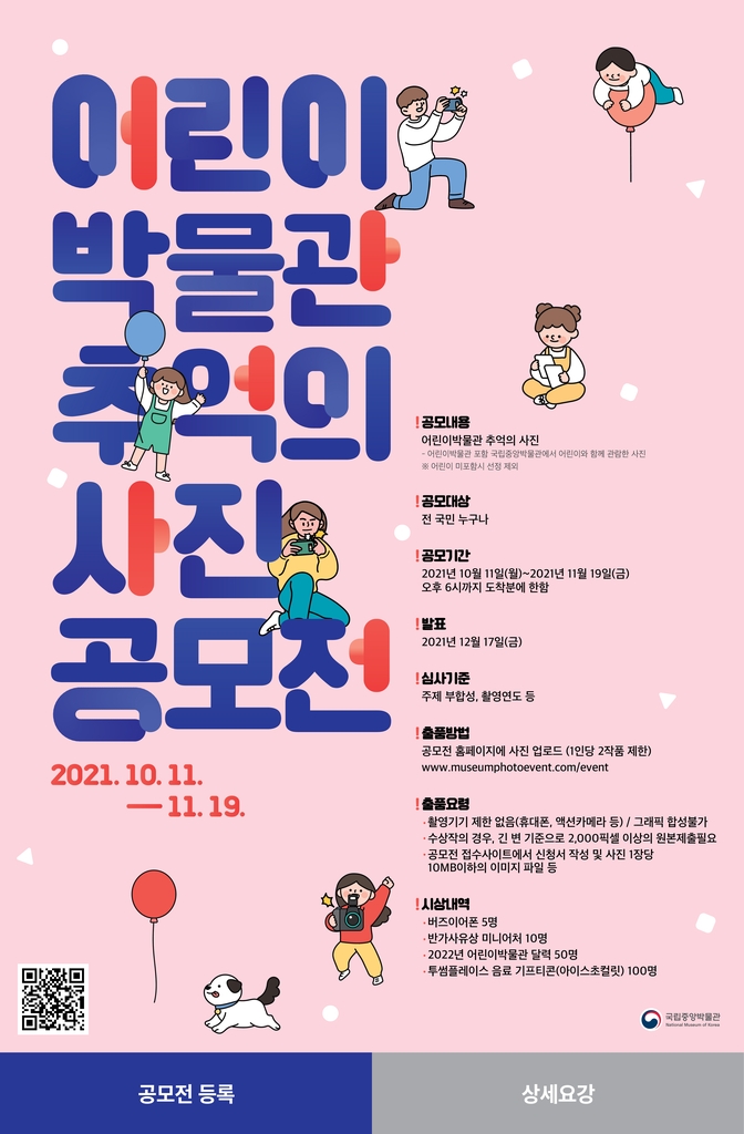 참가를 희망하는 사람은 공모 행사 누리집(museumphotoevent.com/event)에 들어가 국립중앙박물관 혹은 관내 어린이박물관을 방문했을 때 어린이를 촬영한 사진과 글을 등록하면 된다.