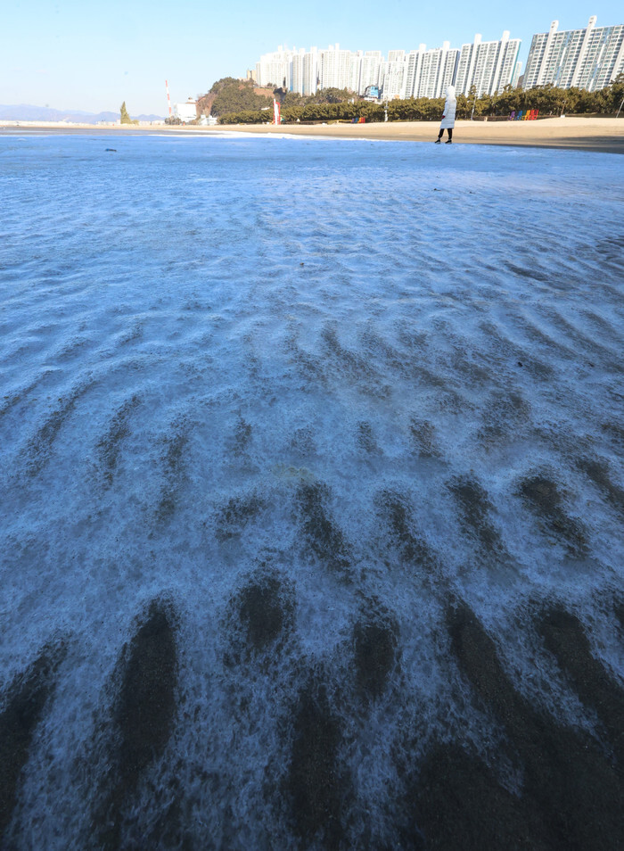 This photo, taken on Feb. 6, 2025, shows sea water frozen on the sand at Dadaepo Beach in the southeastern port city of Busan, as the country is gripped by a cold spell, with the mercury dipping to a low of minus 5.9 C in the region. (Yonhap)