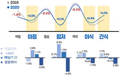 식사 방식을 살펴보니 '아점'과 '점저'로 가정간편식(HMR)을 선택하는 소비자가 각각 3.6%, 4.3% 늘었다.