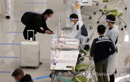 | ▲ A visitor from overseas (L) gets directions to prevent new coronavirus infections from health workers on March 15, 2021, at Incheon International Airport, west of Seoul. (Yonhap) |