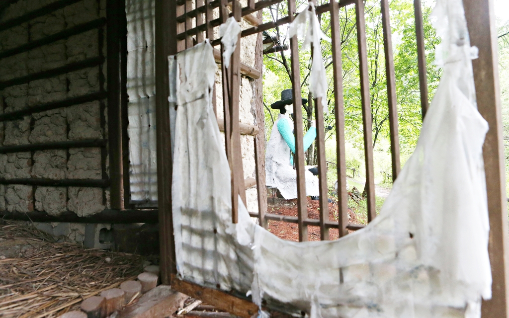 딸을 기다리는 아버지 인형 조형물 뒤편 친정 문짝의 나무 문살은 부서졌고, 한지 문풍지는 너덜너덜 떨어져 있었다.