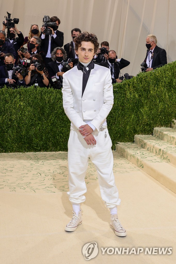영화 '듄' 주연배우 샬라메는 하얀 실크 정장에 스니커즈 차림으로 등장했다.