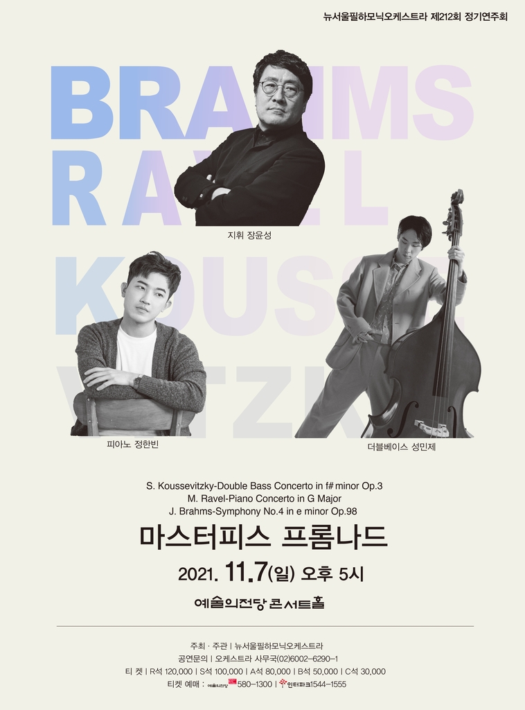 장윤성이 이끄는 뉴서울필하모닉은 쿠세비츠키의 '더블베이스 협주곡', 라벨의 '피아노 협주곡', 브람스의 '교향곡 4번'을 들려준다. 더블베이스 연주자 성민제와 피아니스트 정한빈이 각각 쿠세비츠키와 라벨의 곡을 협연한다.