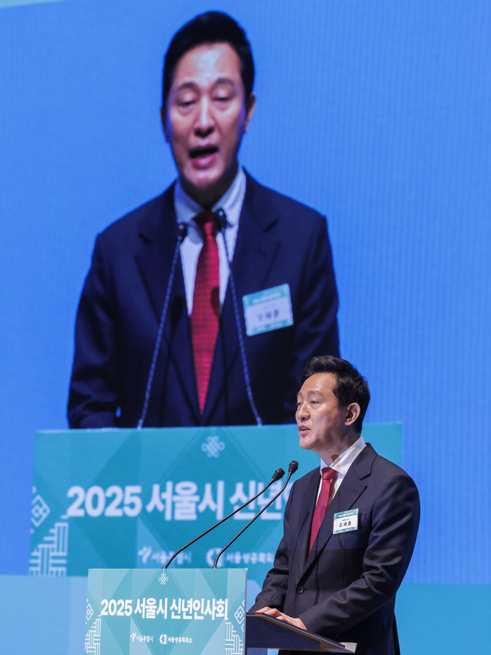 Seoul Mayor Oh Se-hoon addresses a new year meeting of the Seoul metropolitan government at the headquarters of the Korea Chamber of Commerce and Industry in Seoul on Jan. 6, 2025. (Yonhap)
