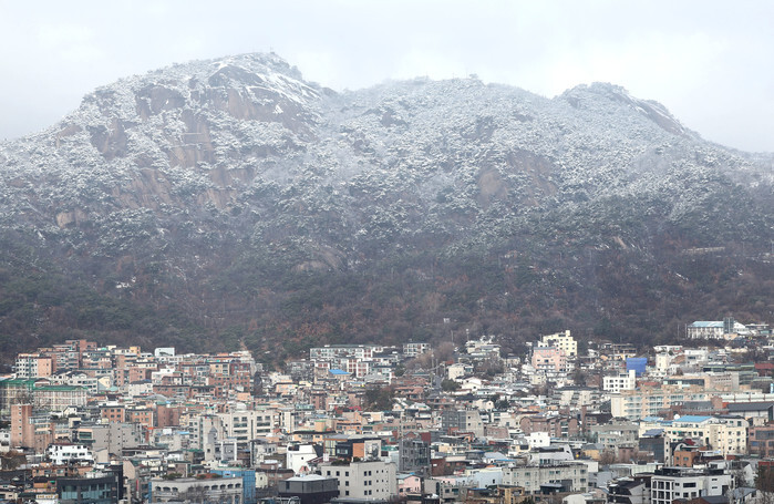 Snow covers Mount Inwang in central Seoul on Feb. 25, 2024. (Yonhap)
