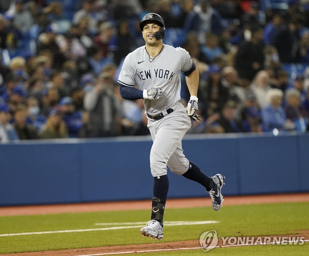 | ▲ 스탠턴, 4경기 연속 홈런 (토론토 USA투데이스포츠/로이터=연합뉴스) 뉴욕 양키스 거포 장칼로 스탠턴이 29일(한국시간) 캐나다 온타리오주 토론토의 로저스파크에서 열린 토론토 블루제이스와의 방문경기, 7회 3점 홈런을 친 뒤 환하게 웃으며 홈으로 달려가고 있다. |