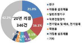 리콜된 품목을 보면 어린이 완구(21.0%)가 가장 많았고 아동용 섬유제품(16.1%), 일반조명기구(6.1%), 직류 전원장치(4.9%), 전기담요 및 매트, 전기침대(4.3%) 등의 순이었다.