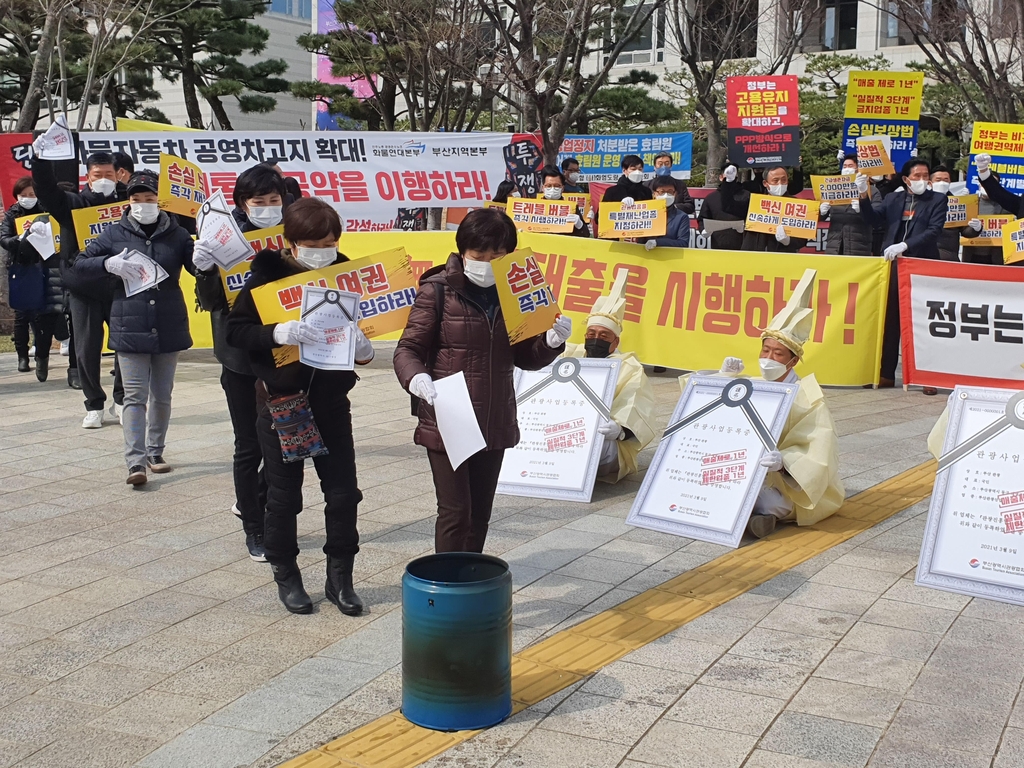 부산시관광협회 관계자 70여 명은 9일 오전 부산시청 앞 광장에서 집회를 열고 "관광업종에 대한 정부와 지자체 대응이 미온하다"고 질타했다.