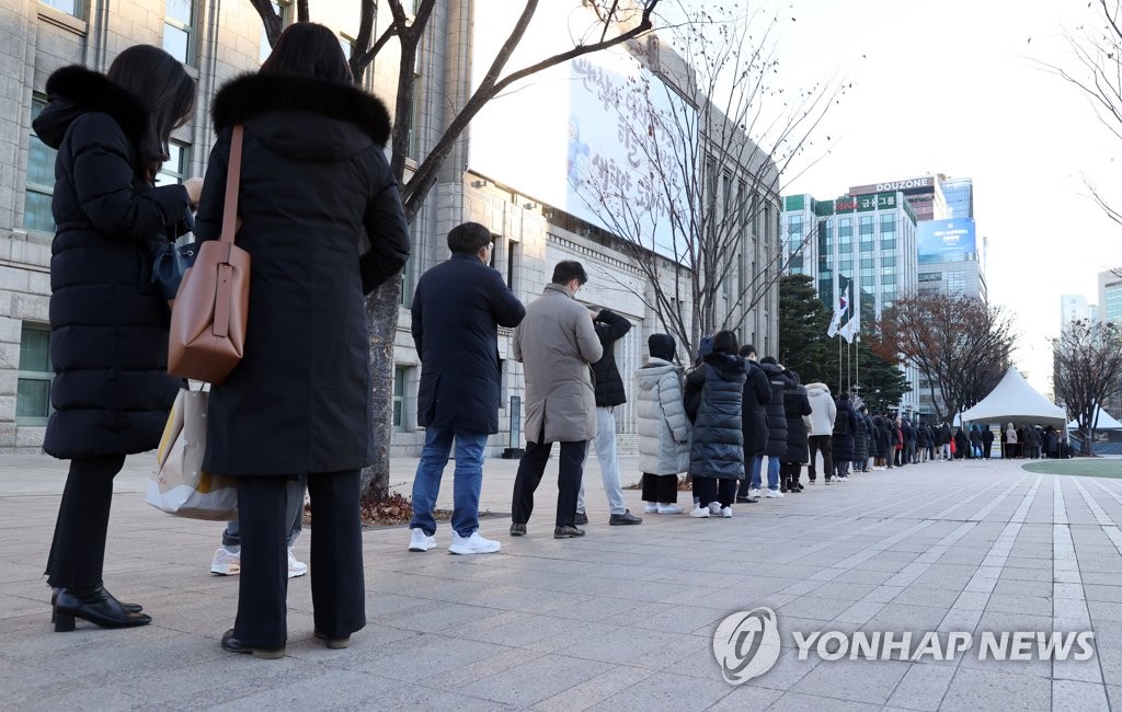 | ▲ People line up to take a coronavirus test at a makeshift facility in central Seoul on Dec. 13, 2021. (Yonhap) |