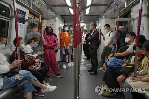 | ▲ (홍콩 AP=연합뉴스) 지난 30일 밤 홍콩의 지하철에 '오징어게임' 분장을 한 승객이 탑승한 모습. 2021.10.31. photo@yna.co.kr |