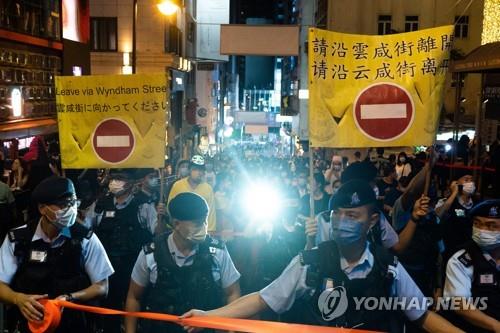 | ▲ 핼러윈 파티 열리는 홍콩 번화가 통제하는 홍콩 경찰들 (홍콩 AFP=연합뉴스) 지난 30일 밤 홍콩의 유흥가 란콰이펑에 경찰이 통제선을 설치하는 모습. 2021.10.31. photo@yna.co.kr |