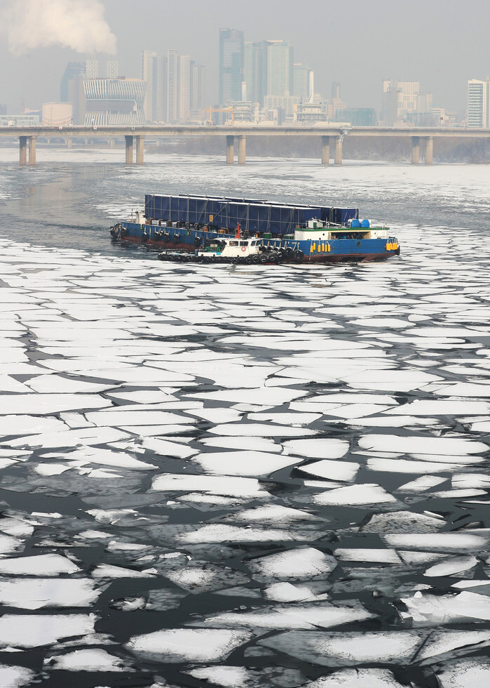 This photo, taken on Jan. 13, 2021, shows the frozen Han River, which bisects the South Korean capital Seoul, covered with snow, following snowfall the previous day. (Yonhap)