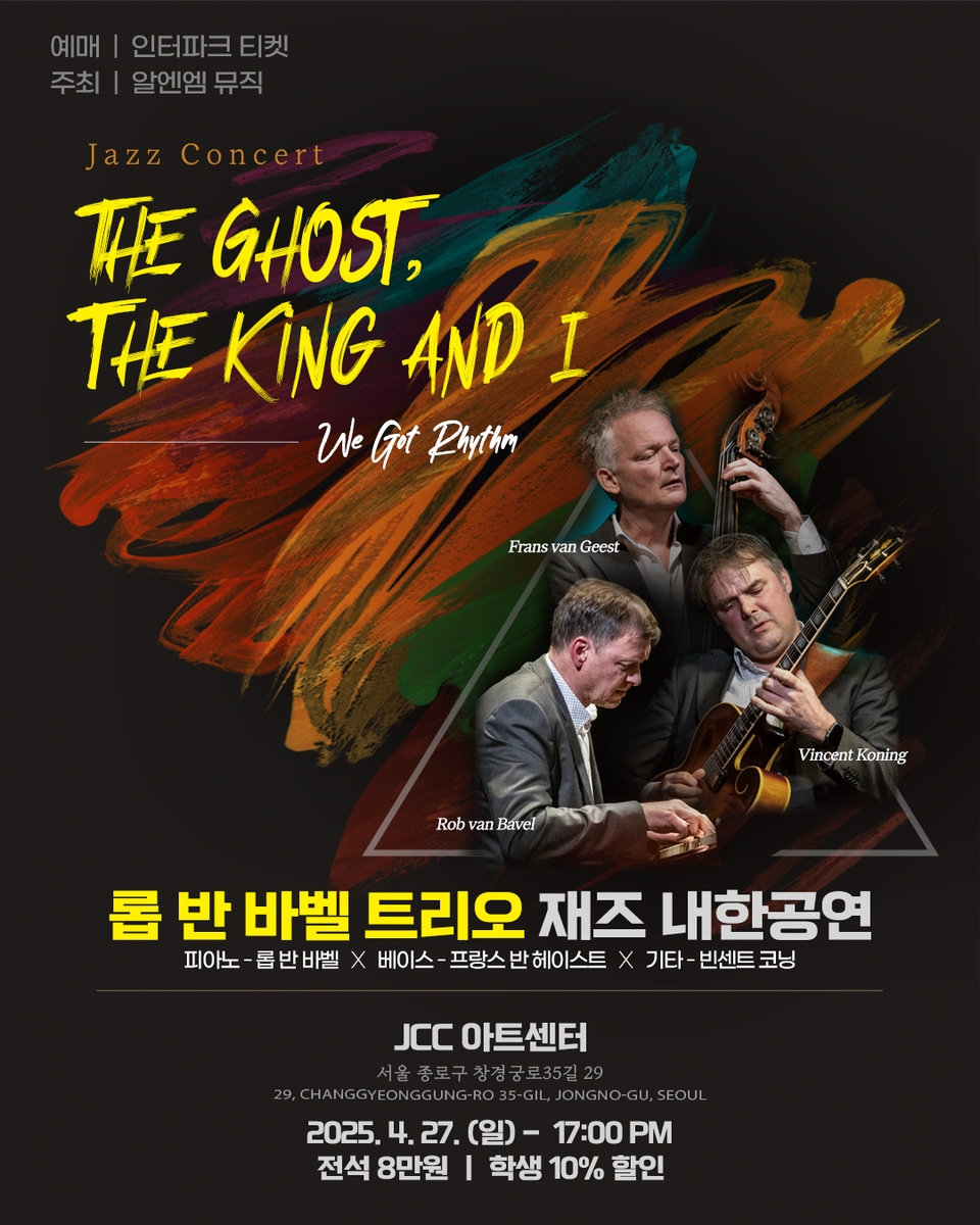 (서울=연합뉴스) 이태수 기자 = ▲ 롭 반 바벨 트리오 내한 공연 = 재즈 피아니스트 롭 반 바벨을 중심으로 한 '더 고스트, 더 킹 앤 아이'(The Ghost, the King and I·이하 GKI) 트리오가 다음 달 27일 오후 5시 서울 JCC아트센터에서 내한공연을 연다고 공연기획사 알엔엠 뮤직이 7일 밝혔다.