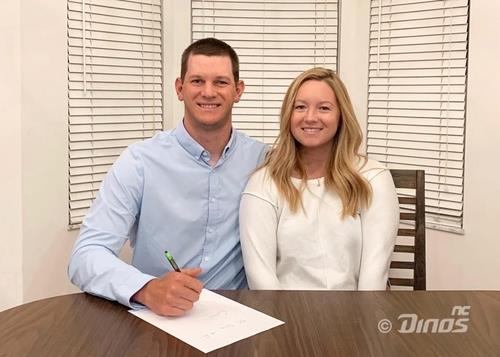 | ▲  Drew Rucinski of the NC Dinos (L) and his wife, Sheridan, smile after Rucinski signed a new contract with the Korea Baseball Organization club, in this photo provided by the Dinos on Dec. 21, 2021. (PHOTO NOT FOR SALE) (Yonhap) |