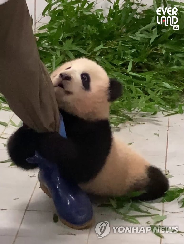 | ▲ 사육사 다리 잡고 매달리는 에버랜드 아기 판다 [에버랜드 제공. 재판매 및 DB 금지] |