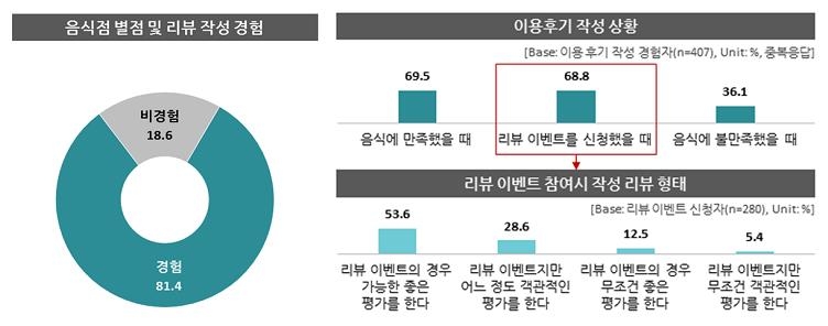 이용 후기를 작성한 적이 있는 소비자는 81.4%에 달했다. 그 이유(중복 응답)로 '음식에 만족했을 때'(69.5%)와 '리뷰 이벤트를 신청해서'(68.8%)를 주로 들었다.