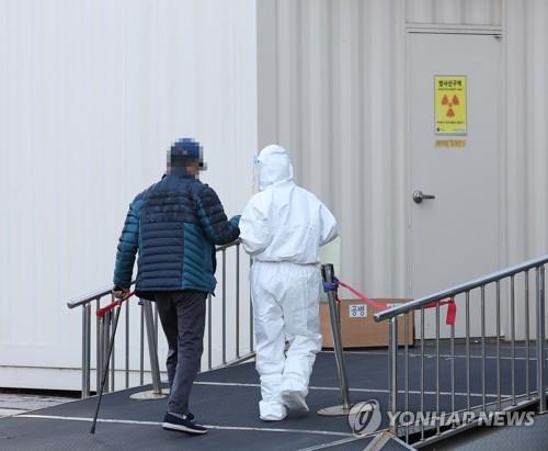 | ▲ A medical worker guides a COVID-19 patient at the Seoul Medical Center in central Seoul on March 28, 2022. (Yonhap) |