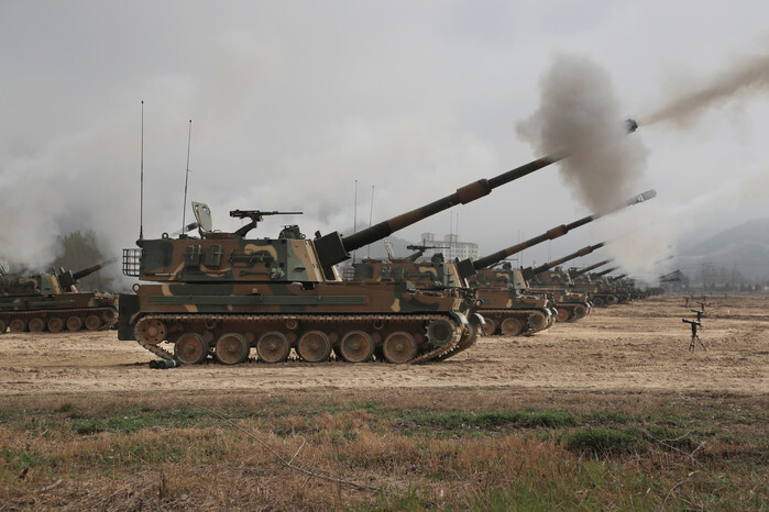 K-9 howitzers fire shells in a drill at a firing range in Cheorwon, about 90 kilometers northeast of Seoul, on April 17, 2024. (Pool photo) (Yonhap)