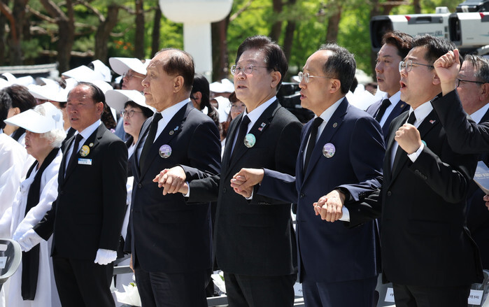Choo Kyung-ho (2nd from R), the ruling People Power Party's floor leader, and the main opposition Democratic Party's leader Lee Jae-myung (3rd from R) hold hands while singing the signature song for the 1980 pro-democracy uprising in Gwangju, called "March for the Beloved," during a ceremony marking the 44th anniversary of the movement at the May 18th National Cemetery on May 18, 2024. (Pool photo) (Yonhap)