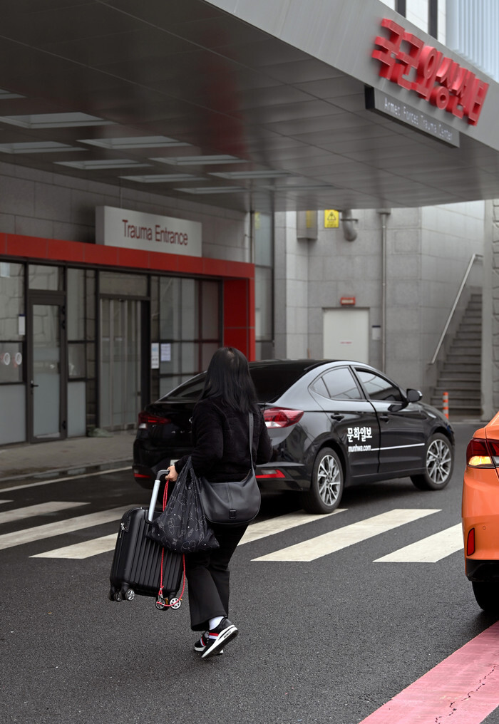 A civilian patient's relative arrives at the emergency room of the Armed Forces Capital Hospital in Seongnam, south of Seoul, on Feb. 20, 2024, as the military opened its hospital emergency rooms to the public to deal with doctors' mass collective action against the government's plan to increase medical school admissions. A total of 6,415 out of the country's around 13,000 trainee doctors at 100 hospitals have submitted their resignations in protest of the plan. (Pool photo) (Yonhap)