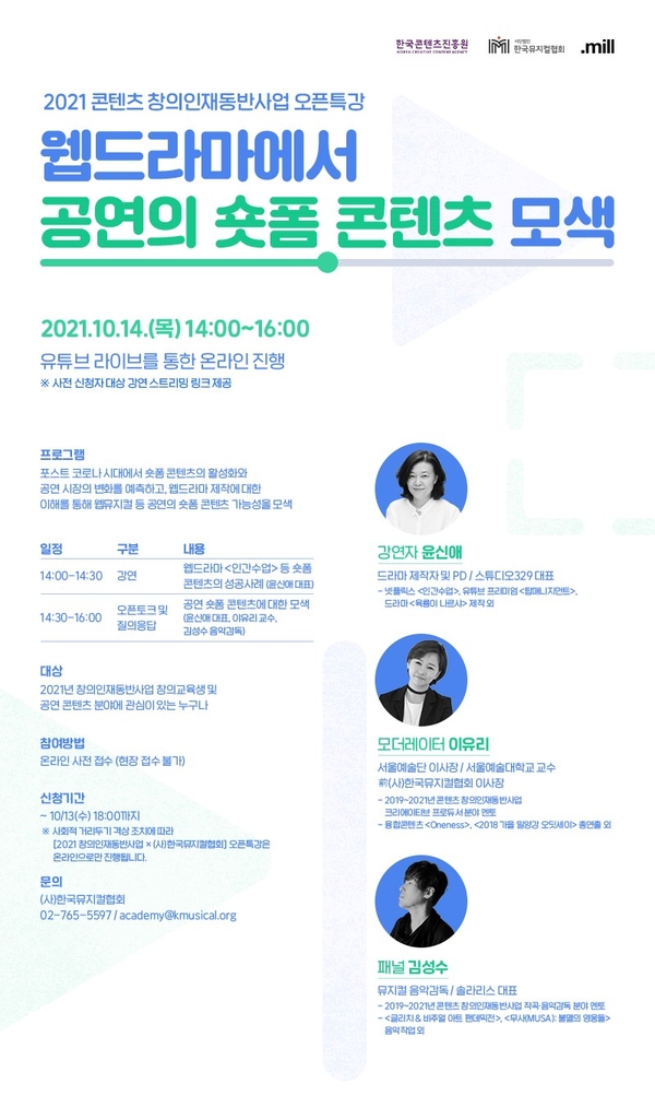 ▲ 한국뮤지컬협회는 오는 14일 오후 2시 '2021 콘텐츠 창의인재동반사업' 온라인 오픈특강을 개최한다. 콘텐츠 창의인재동반사업은 문화체육관광부와 한국콘텐츠진흥원이 주최하는 창작자 육성 사업이다. 이번 특강은 '웹드라마에서 공연의 숏폼 콘텐츠 모색'을 주제로 한다. 스튜디오329의 윤신애 대표가 강연자로 나서며, 이유리 서울예술단 이사장이 모더레이터(문제해결을 유도하는 역할), 김성수 뮤지컬 음악감독 겸 음악 프로듀서가 패널로 참석한다. 13일 오후 6시까지 한국뮤지컬협회 홈페이지(kmusical.kr)에서 신청할 수 있다. (서울=연합뉴스)