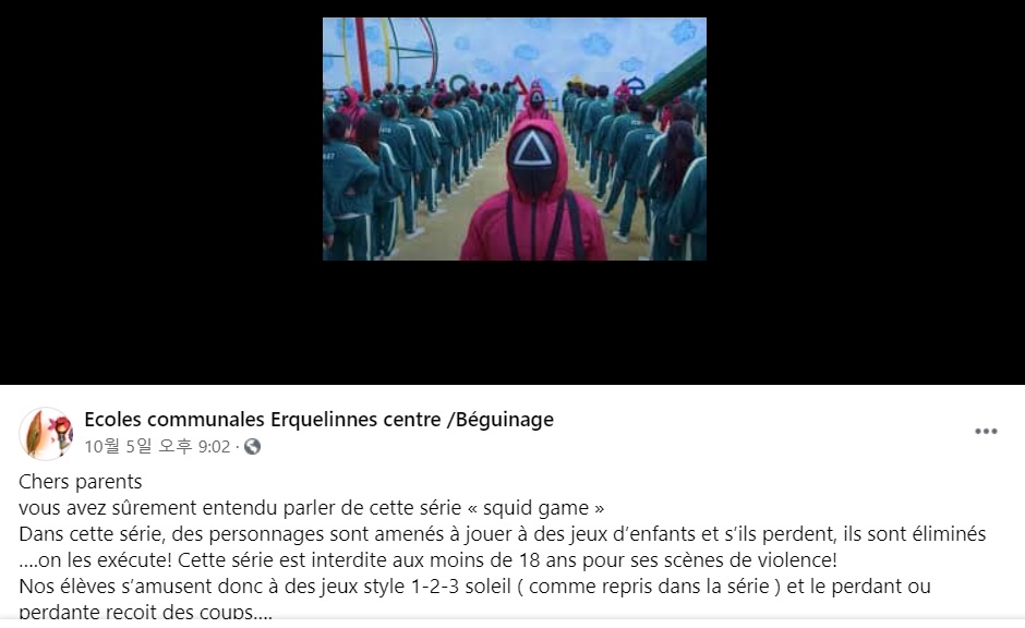 뉴욕포스트에 따르면 벨기에의 한 학교는 페이스북에 올린 공문에서 "'오징어 게임'은 폭력적인 장면들 때문에 18세 미만에게 금지된 시리즈"라면서 "우리는 불건전하고 위험한 놀이의 중단을 위해 경계하고 있다"고 밝혔다.