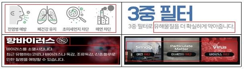 이들 제품은 '바이러스 차단', '미세먼지 차단', 'KF 등급', '비말차단' 등의 문구를 상품 설명에 사용했는데, 제품의 실제 성능이나 품질은 이에 미치지 못했다.