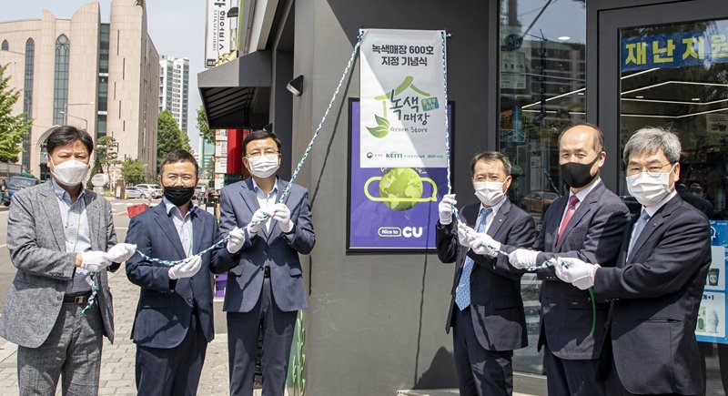 | ▲ CU서초그린점, 업계 최초 환경부 녹색매장 지정 (서울=연합뉴스) 편의점 CU를 운영하는 BGF리테일이 서울 서초구 잠원동에 있는 CU서초그린점이 업계 최초로 환경부 녹색매장 지정을 받았다고 17일 밝혔다. 녹색매장은 녹색 제품 판매, 에너지 절약, 폐기물 감축 등 친환경적으로 운영되는 매장을 환경부가 지정하는 제도다. 사진은 녹색매장 지정 기념식 모습. 2020.6.17 [CU 제공. 재판매 및 DB 금지] photo@yna.co.kr |