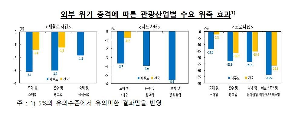 제주 관광 수요에 부정적인 영향을 끼친 2014년 세월호 사건과 2017년 고고도미사일방어체계(THAAD·사드) 배치에 따른 중국의 경제 보복, 2020년 신종 코로나바이러스 감염증(코로나19) 사태 등 3차례 외부 충격에 대해 분석한 결과 교통안전에 대한 우려, 국가 간 갈등 확산, 전염병 확산 우려 측면에서 제주 관광 수요에 악영향을 미쳤다.