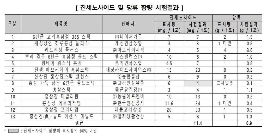 | ▲ 제품별 진세노사이드 및 당류 함량 [한국소비자원 보도자료 캡처. 재판매 및 DB 금지] |