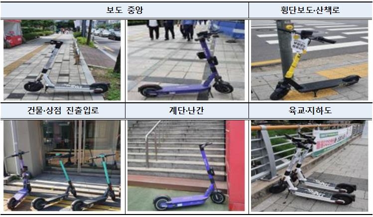 소비자원이 서울 주요 지하철역 주변 40개 지점에서 전동킥보드 주·정차로 인한 통행 및 시설 이용 방해 사례 673건을 분석한 결과, 점자 보도블록이나 어린이 보호구역 등에 세워 교통약자를 포함한 보행자의 통행을 방해하는 사례가 57%를 차지했다.