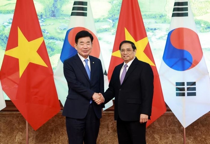 South Korean National Assembly Speaker Kim Jin-pyo (L) poses for a photo with Vietnamese Prime Minister Pham Minh Chinh during their meeting in Hanoi on Jan. 17, 2023, in this photo released by the South Korean parliament. (PHOTO NOT FOR SALE) (Yonhap)