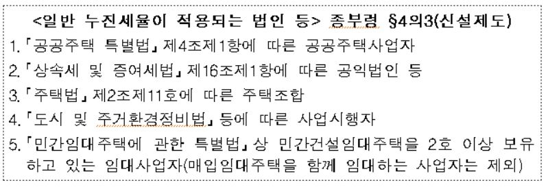 앞선 세법 개정에 따라 올해부터는 법인의 주택분 종부세 계산 시 최고 단일세율(3·6%)을 적용하지만 공공주택사업자, 공익법인, 주택조합 등에는 일반 누진세율(2주택 이하: 0.6∼3.0%, 조정 2주택·3주택 이상: 1.2∼6.0%)을 적용한다. 단 해당 법인은 절차에 따라 신청해야 한다.