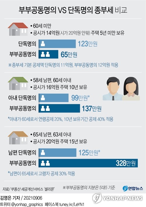 | ▲ [그래픽] 부부공동명의 VS 단독명의 종부세 비교 [연합뉴스 자료그래픽] |