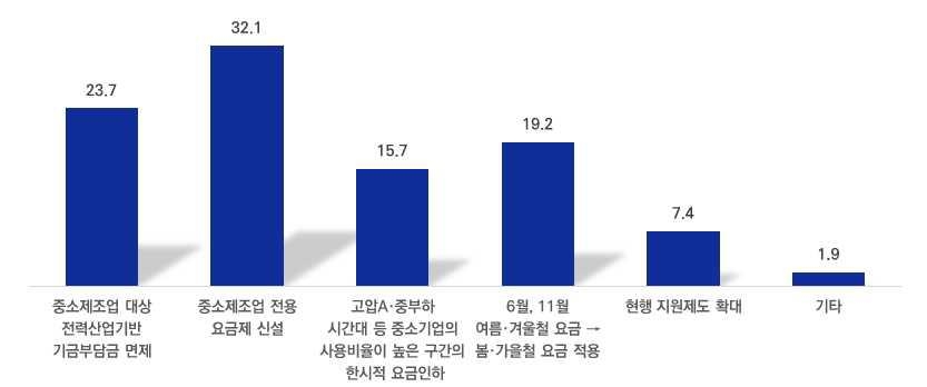 전기요금과 관련해 가장 바라는 정책은 중소 제조업 전용 요금제 신설(32.1%)이 가장 많았다. 그다음으로 중소제조업 대상 전력산업기반기금 부담금 면제(23.7%), 6월·11월과 여름·겨울철 요금의 봄·가을철 요금 적용(19.2%) 등의 순이었다.