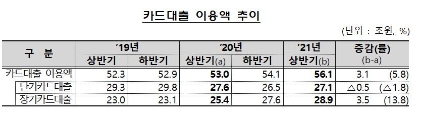 상반기 카드대출 이용액은 56.1조원으로 작년 상반기보다 5.8% 늘었다. 특히 장기카드대출(카드론) 이용액은 13.8% 늘어나 28.9조원에 달했다.