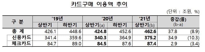 법인 신용카드 이용액 증가율이 유난히 큰 것은 작년 상반기에 코로나19 충격으로 5.1% 감소한 기저효과가 주요 원인이다.