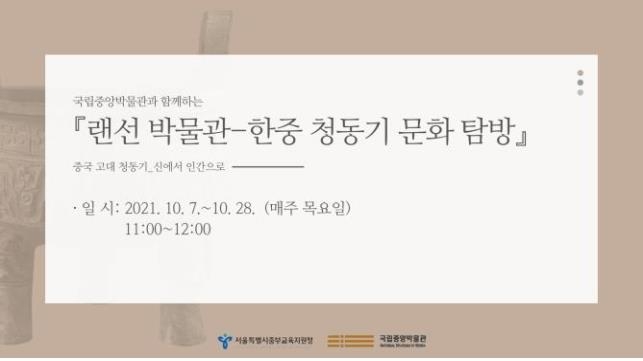 (서울=연합뉴스) 이도연 기자 = 서울시중부교육지원청은 국립중앙박물관과 함께 '랜선 박물관-한중 청동기 문화 탐방' 프로그램을 운영한다고 6일 밝혔다.