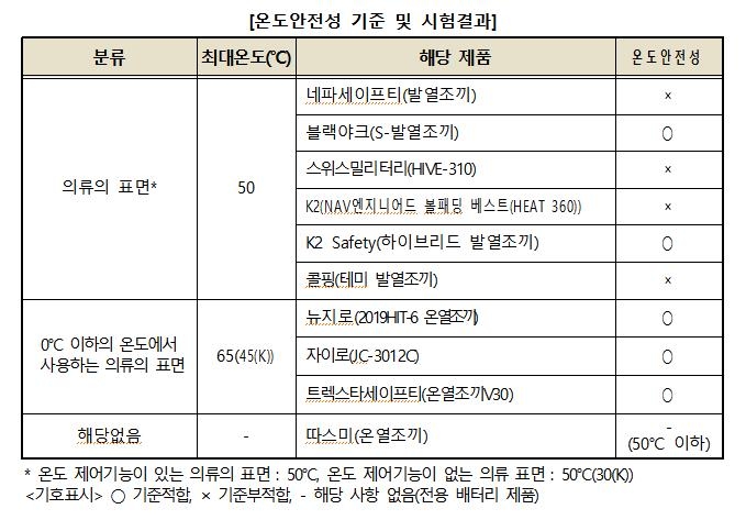 | ▲ 발열조끼 온도안정성 기준 및 시험 결과 [한국소비자원 제공, 재판매 및 DB 금지] |