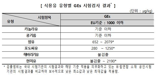 콩기름, 카놀라유, 해바라기유 제품은 EU 기준치(1,000㎍/㎏ 이하)에 적합한 글리시딜 지방산 에스터(GEs)가 검출됐거나 아예 검출되지 않았으나 팜유와 현미유, 포도씨유 중 5개 제품은 기준치를 초과했다.
