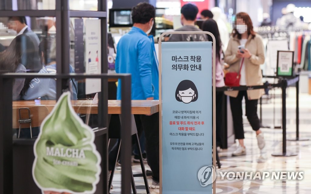 | ▲ '12일부터 실내에서도 상시 마스크 착용해야' (서울=연합뉴스) 김도훈 기자 = 마스크 착용 의무화 조치를 하루 앞둔 11일 오전 서울 시내의 한 백화점의 커피숍에 마스크 착용 안내 배너가 설치돼 있다.