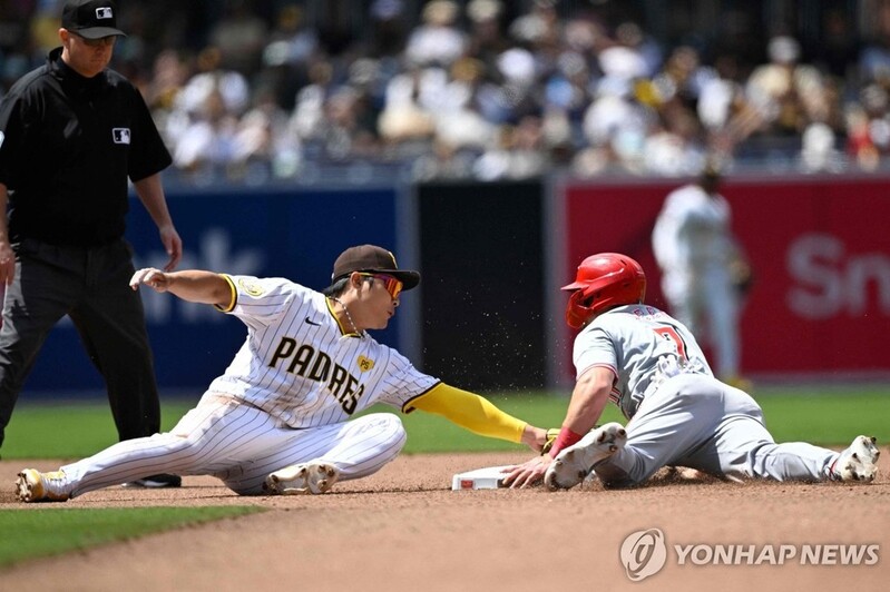 | ▲ 4회 도루를 시도하는 상대 선수를 태그하는 김하성 [AP=연합뉴스] |