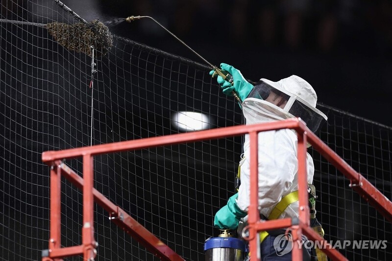 | ▲ 백스톱 보호망에 있는 벌떼를 퇴치 중인 방역회사 직원 힐튼 [게티이미지/AFP=연합뉴스] |