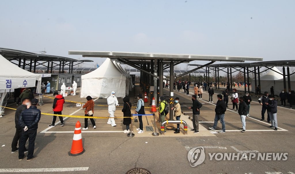| ▲ People stand in line to undergo COVID-19 testing at a temporary screening station in front of Seoul Station on March 16, 2021. (Yonhap) |