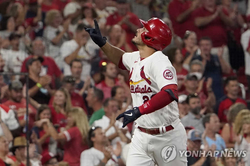 | ▲ 놀런 에러나도의 쐐기 홈런 (세인트루이스 AP=연합뉴스) 세인트루이스 카디널스 내야수 놀런 에러나도가 29일(한국시간) 미국 미주리주 부시 스타디움에서 열린 메이저리그 밀워키 브루어스와의 홈경기에서 7회 솔로 홈런을 친 뒤 환호하고 있다. |