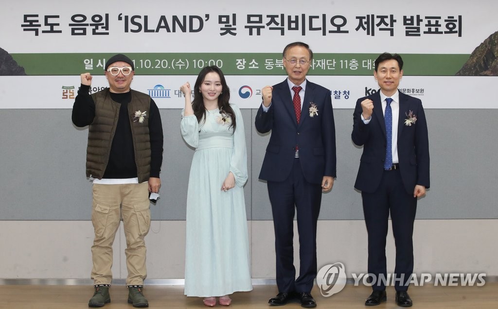 동북아역사재단은 '독도의 날'을 닷새 앞둔 이날 서대문구 재단 대회의실에서 제작 발표회를 열어 여러 예술가가 재능기부 형태로 참여해 완성된 '아일랜드' 음원과 뮤직비디오를 선보였다.