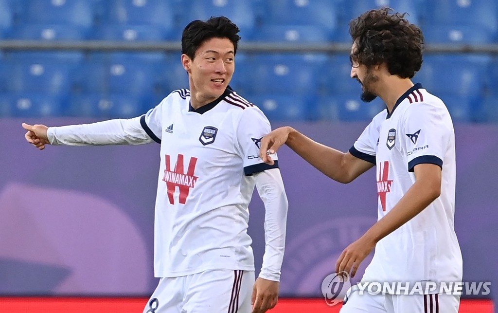 | ▲ 야신 아들리(오른쪽)의 축하를 받는 황의조 (AFP=연합뉴스) |